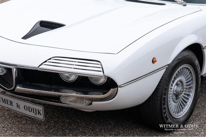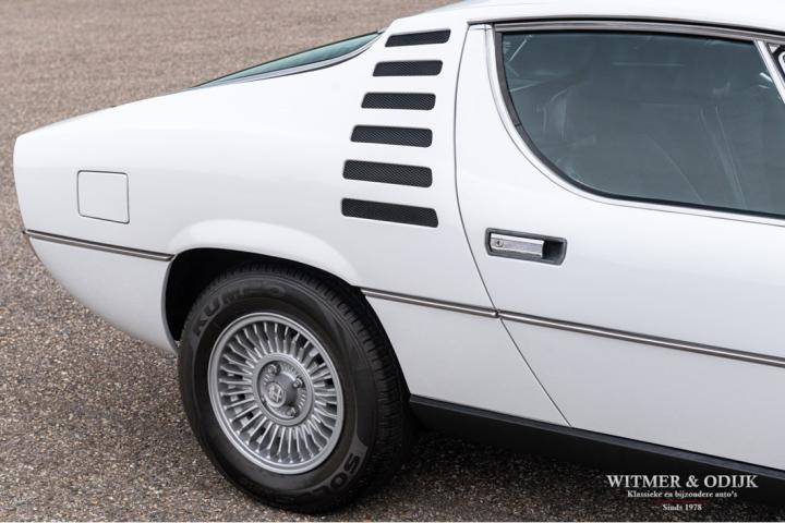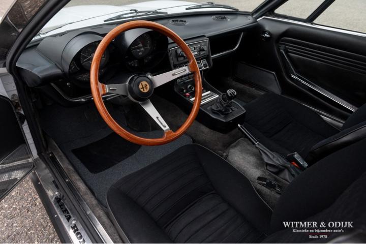 The Alfa Romeo Montreal, the magnificent design by Marcello Gandini, also the designer of the legendary Lamborghini Miura as the air intakes behind the doors confirm, was presented in 1967 at the Expo 67 in Montreal. There the concept kept the unofficial name that the public had started to give the car in Canada after which the factory eventually took it over. At that time, the Montreal, just like the recent C8, was design-wise far above the average 4-cylinder range of Alfa Romeo. For example, there was the V8 that was derived from the engine of the famous 33 Stradale, a 5-speed gearbox from the German ZF, a limited slip differential, dry-sump lubrication, the SPICA injection system and last but not least the beautiful design. Most striking details; the headlight grilles that fold away when using the light, the bonnet with beautifully camouflaged curvature and the air vents that are also present on the Miura. Which by the way should have been air intakes in the first place because the design would have a mid-engine. Now one of the most beautiful style elements of the Montreal. Finally, click on the photos of the speedometer and rev counter and see that the Montreal is also unique at this level of detail. In recent years, she has been one of the strongest rising stars in the classic firmament, for incomprehensible reasons the appreciation was not always there, which is why restorations from the past were often cheap and poorly executed. This Alfa Romeo Montreal has been preserved so well that she was only repainted once for cosmetic reasons. The paintwork deserves a special mention. Flawless craftsmanship. She has been used so little that the car is otherwise completely in original condition, which makes this Montreal a very special and iconic classic.