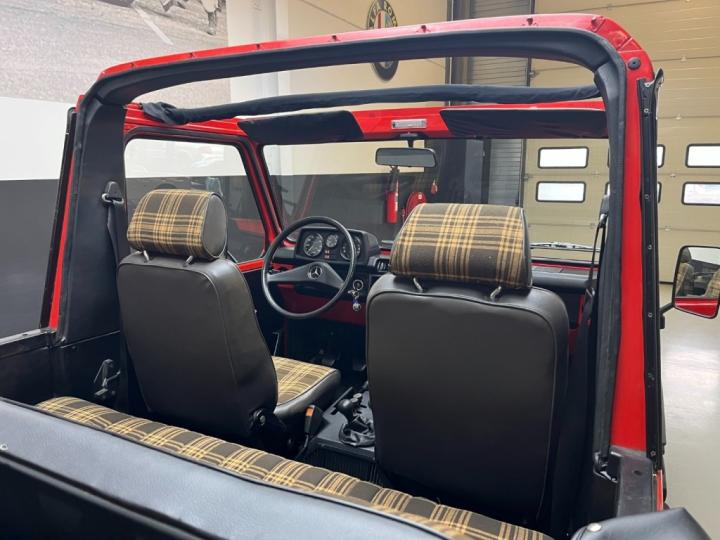 Inside, the car features one of the most desirable and rare upholstery options for a W460: the original Schottenkaro tartan fabric. Most early G-Wagons were delivered with simple black interiors, so finding a Cabriolet with this original tartan trim and in such authentic condition is extremely uncommon. It gives the car a warm and period-correct charm.